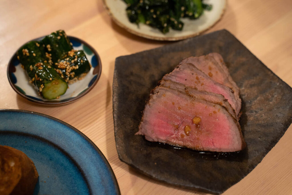 ローストビーフ、きゅうり、小松菜とわかめのサラダ、パン。
